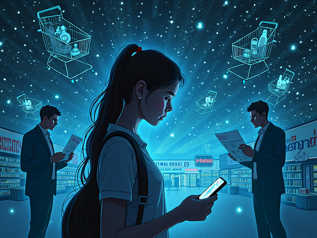« Une illustration surréaliste dépeignant le concept de confidentialité des données et de publicité ciblée. L'image est centrée sur une adolescente tenant un smartphone, entourée de flux de données tourbillonnants composés de chariots de supermarché, d'articles de puériculture tels que des berceaux et des bouteilles, et de motifs algorithmiques aux couleurs néon. À l'arrière-plan, le logo d'un magasin de détail se fond subtilement dans les vagues numériques. Au premier plan, un père inquiet tient un prospectus de produits pour bébés, l'air perplexe. Le ton général doit être inquiétant et futuriste, avec un éclairage doux mettant en valeur les personnages et une superposition matricielle symbolisant l'extraction de données et la reconnaissance des formes. »